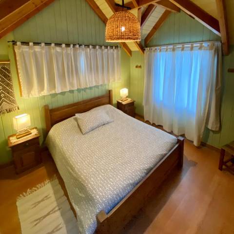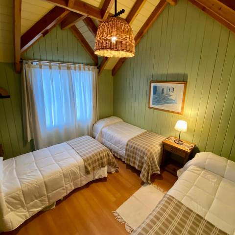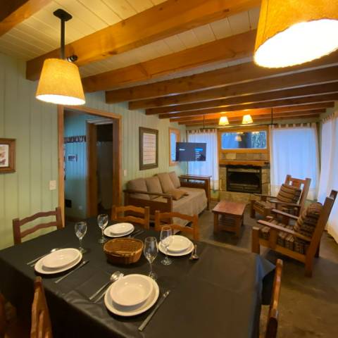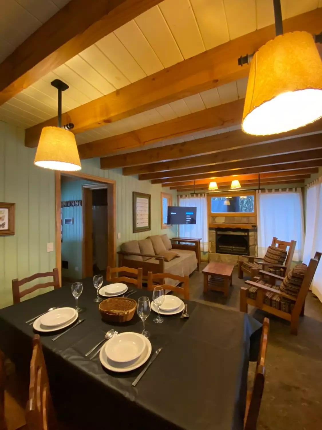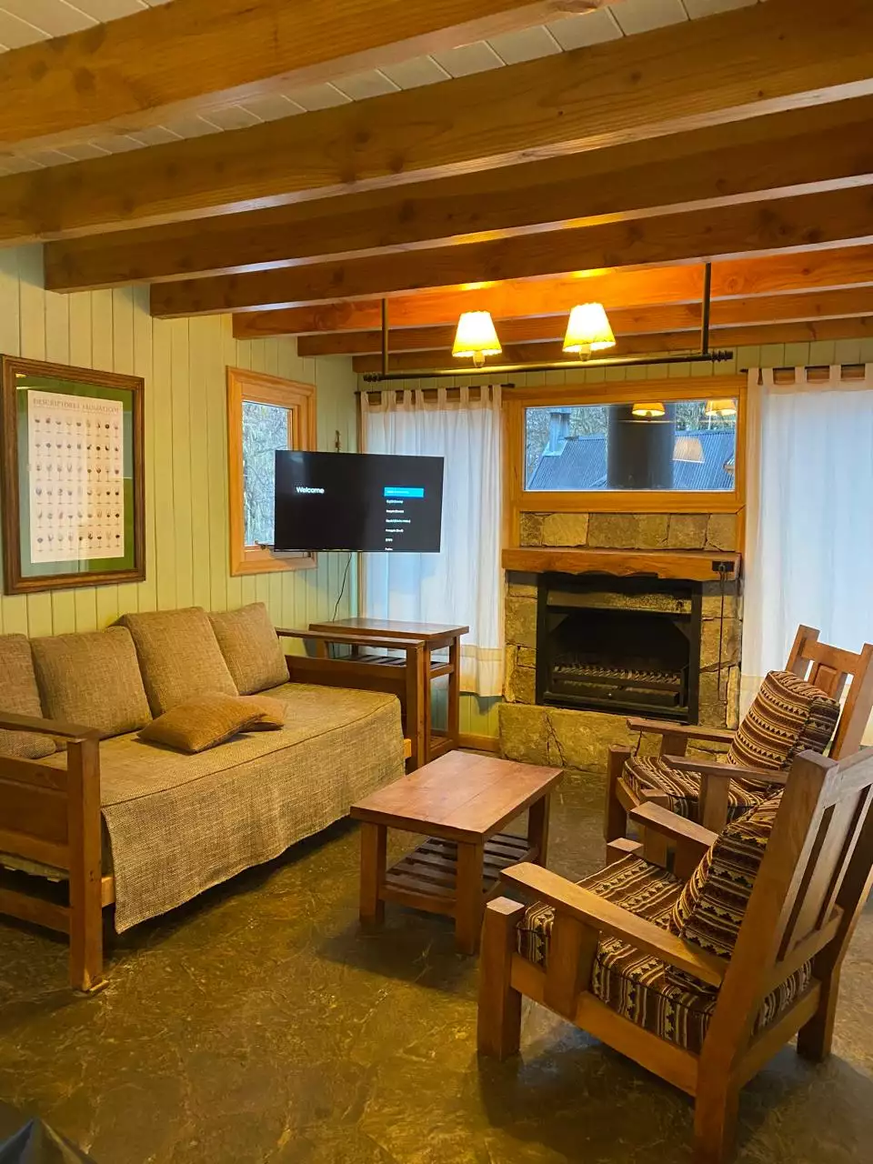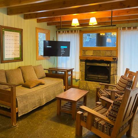 En planta baja, nuestras cabañas ofrecen cocina totalmente equipada, living-comedor integrados con hogar a leña y SmartTV y un baño con ducha. En planta alta, encontrarás un dormitorio matrimonial, un dormitorio con camas individuales o cucheta y un baño completo con bañera.